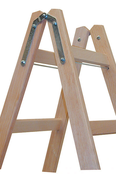 Дополнительно - Стремянка из дерева без пропитки, пригодна для выполнения самых разнообразных работ, боковины сделаны из высококачественной твердой древесины без сучков, перекладины соединены цилиндрическим шиповым соединением, стальные шарниры прикручены прочно и многократно резьбовыми креплениями, для защиты от расхождения используются цепные перемычки, направляюще-фиксирующие накладки сцепляют секции стремянки во время транспортировки. По технике безопасности EN 131 ч.3 - подниматься можно не выше 3 сверху ступени/перекладины