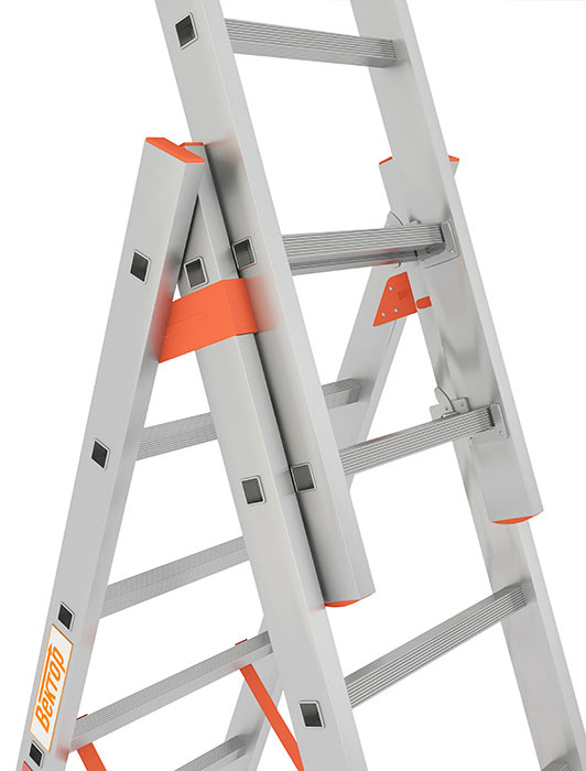 Дополнительно -в линейке многофукционнальных лестниц Вектор серии 44 присутствует ряд особенностей, повышающих надёжнсть и эксплутационные качества, это: увеличенный размер ступеней - 25мм, два замка на каждой секции, уменьшающие возможные люфты (шатание секций относительно друг друга), уникальный механизм раскладывания лестницы в стремянку.